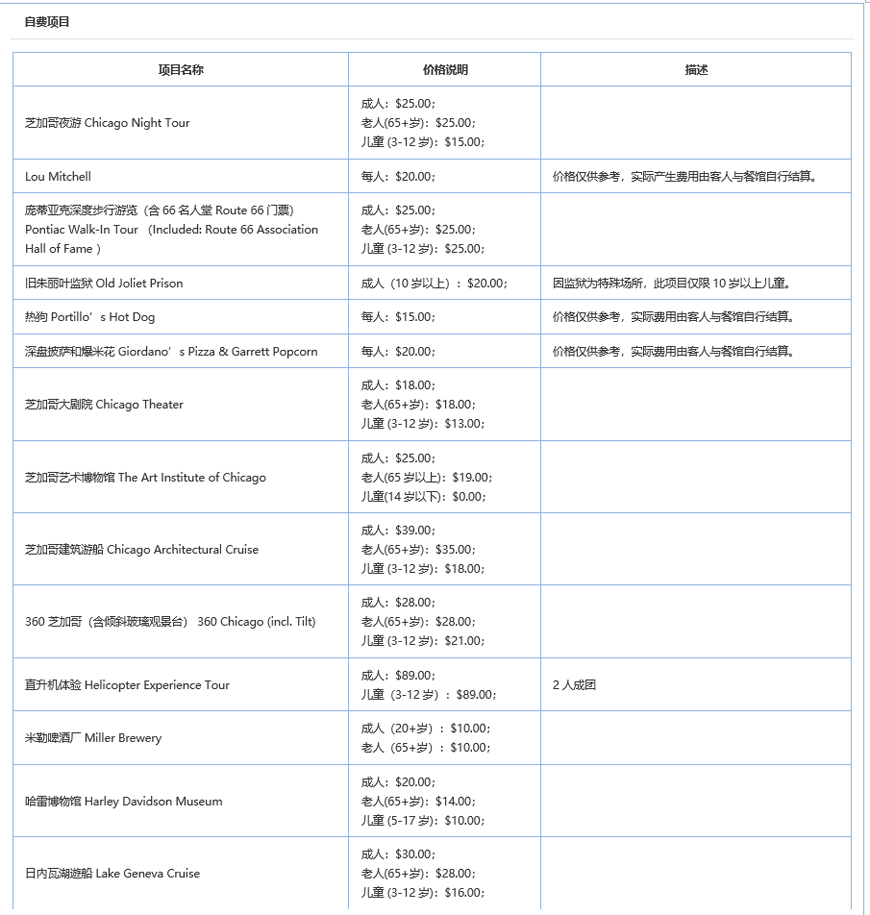 接机:芝加哥奥黑尔国际机场ORD(机场); 团体免费机场接机:9:00AM - 9:00PM。详细接机资讯参考第一日行程。