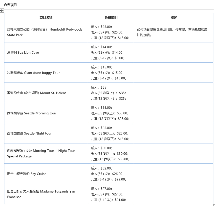 特殊说明:红堡红杉木州立公园必付项目含进山门票、停车费、车辆耗损和燃油附加费。